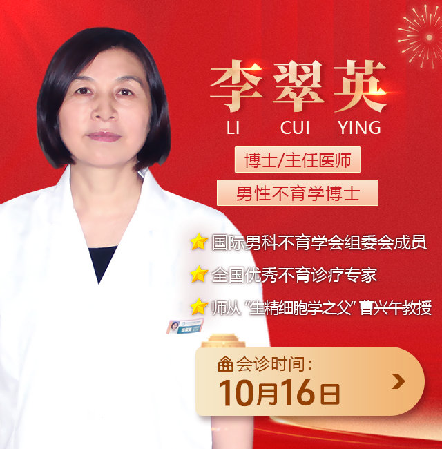 李翠英博士:与“生精细胞学之父”曹兴午教授并称我国男性不育“互证治疗”的“黄金搭档”,长期从事不孕不育的研究和临床工作,在中医中药领域拥有很高的造诣。善于利用传统医学精华,中西医合璧治疗少精症、弱精症、死精症、无精症、不射精症、逆行射精症及睾丸发育不良等男性不育疑难病症。在治疗男性不育方面拥有丰富的诊疗经验及独特的疗法。点击在线咨询,预约专家会诊名额